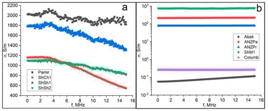 Frequency dependence of the conductivity of the first type (a) and the second and third types (b). Samples code: Pamir—natural graphite; ShCh1, ShSh1, ShSh2, ShM1—samples of shungite carbon from various occurrences of Karelia; anthraxolites from Kazakhstan (Abak), Novaya Zemlya islands (ANZPa, ANZPr), and Colombia (Columb).