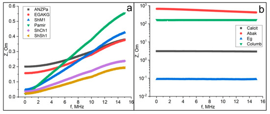 The dependence of the impedance on the frequency (a—samples with an increase in impedance. b—samples with a constant or decreasing impedance). Samples code: Pamir—graphite; ShCh1, ShSh1, ShSh2, ShM1—samples of shungite carbon from various occurrences of Karelia; anthraxolites from Kazakhstan (Abak), Novaya Zemlya islands (ANZPa, Calcit, Eg), Colombia (Columb), and Subpolar Ural, Kozhim river (EGAKG).