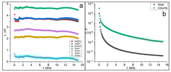 For the vast majority of samples, the reactance increases almost linearly with frequency. In the case of an inductive type of resistance (reactance , where ) with increasing frequency, f, the reactance, X, also grows linearly, so the inductive resistance, L, practically does not depend on frequency and does not contribute to this dependence (Figure 12 and Figure 13). In the case of a capacitive type of resistance (reactance ) for the Abak and Columb samples, it is the capacitance that makes the determining contribution (see Figure 13). In each frequency interval, the capacitance decreases more than the frequency increases, which determines some increase in reactance.