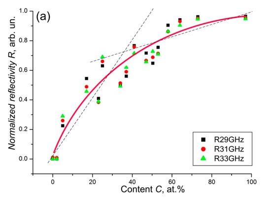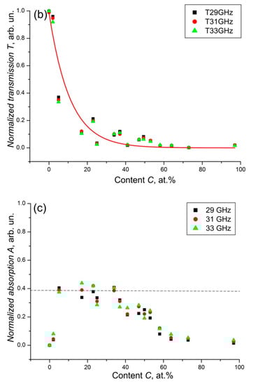 The dependence of the reflection (a), transmission (b), and absorption (c) of electromagnetic radiation on the carbon concentration of shungite plates in the frequency range 26–38 GHz. Approximation (red line in (a,b)) is performed at a frequency of 31 GHz (from [80]).