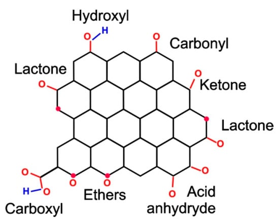 At the molecular level, in disordered graphitic carbons, electrical conductivity generally increases with an increase in the ratio of sp2/sp3-hybridized bonds due to the delocalized electrons introduced by the sp2 bond [81]. This delocalization facilitates the transport of electrons in the plane of the graphene layer, making it highly conductive, in contrast to the high resistivity in systems containing a rigid network of localized sp3 bonds [82]. Additionally, edge functional groups, such as carbonyl, carboxyl, and lactone, which frame the edges of graphene layers in disordered carbon (Figure 15), significantly affect molecular conductivity [6,52]. The presence of such functional groups and the fragmentation of the structure contribute to a significant decrease in electrical conductivity. This relates to the destruction of the π-conjugated system of bonds and their overlapping by the indicated groups. The removal of most functional groups from the edges of graphene layers during the thermal and chemical transformation of bitumen in the geological environment results in the rearrangement of the π-conjugated system. The increase in conductivity occurs due to the removal of the functional groups of the base planes in the packs of graphene layers in the process of reduction of mobile oxygen-containing groups and destruction of hydrogen-containing groups. The key importance of such a chemical transformation with the removal of functional groups is shown in [83], where the thermal destruction of hydrogen-containing groups in bitumen of an average degree of transformation contributes to the appearance of electrical conductivity before the start of graphite-like ordering of the structure. The last factor distinguishes the molecular mechanisms of the conductivity of synthetic glassy carbon and natural disordered carbon, since glassy carbon is much more “pure” and functional groups practically do not affect its conductivity.