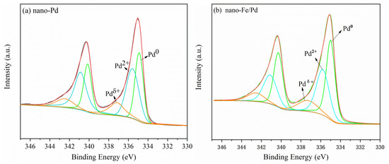 XPS was also performed to analyze the chemical states of metallic species in the nanocatalyst to study their interaction. Figure S3a depicts the Fe 2p XPS spectra of the bimetallic samples. It can be seen that the 2P3/2 level spectra of Fe are fitted with three peaks at 707.8 eV, 710.4 eV, and 712.6 eV, which are assigned to the species of metallic Fe0, Fe2+, and Fe3+, respectively [15,23,24]. The Fe2+ and Fe3+ species of the catalyst surface are most likely oxidized by Fe0 species in the air. Figure 4 shows the 3d5/2 level spectra of Pd in nanoalloy catalysts are better fitted with three symmetrical peaks at approximately 334.7, 335.8, and 337.5 eV, assigned to metallic Pd, PdO, and Pdδ+ (2 ˂ δ ≤ 4) species, respectively [25,26]. To further evaluate the expected composition and elemental mapping of the catalyst samples, XPS and ICP-OES elemental analyses were used. Interestingly, XPS results show that the molar ratio of Pd to Fe in the nano-Fe/Pd catalyst is 6.2:1, while ICP-OES analysis results are relatively close to the nominal atomic ratios (nPd:nFe = 9.8:1). This proves Fe elements tend to enrich at the surface, rather than migrate to the core of the nano-Fe/Pd.