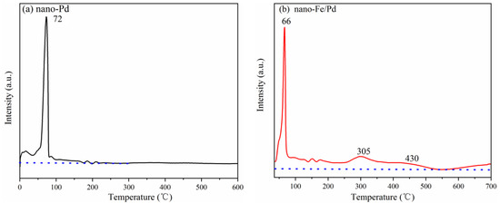 H2-TPR was implemented to investigate the mutual effect of the Pd and Fe species in the catalyst. The negative peak at approximately 0 °C in the H2-TPR profile (Figure 5) of the nano-Pd catalyst is attributed to the hydrogen release from palladium hydride (PdHx) decomposition [15,26]. The peak at 72 °C is ascribed to the reduction of PdO to metallic Pd (Figure 4a). As is shown in Figure 5b, the reduction peak of PdO to the metallic Pd of nano-Fe/Pd catalysts appeared at 66 °C. The nano-Fe/Pd catalyst also has a broad peak, which is associated with the reduced peaks of Fe2O3 to Fe3O4 (305 °C) and Fe3O4 to FeO (430 °C). It is worth noting that the reduced peak of the corresponding metal oxides was lower than the experimental results from the literature [26]. It was proposed that the interaction between two metal species affected the reducibility of the catalyst. Meanwhile, the H2 consumption (Table S1) of catalysts was calculated by integrating the corresponding peak areas with that of the standard sample (AgO), which further proves that alloying a small amount of Fe into the nano-Pd crystalline might increase the electron density around the Pd atom, which could improve catalyst activity and stability for acetylene dicarbonylation.