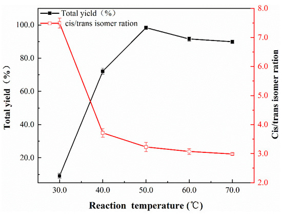 According to previous reports [2], the acetylene conversion is shown to be strongly influenced by the temperature, CO pressure, reaction duration, and co-catalyst KI dosage. Figure 6 shows the temperature effect on the catalytic performance of the nano-Fe/Pd catalyst for acetylene diycarbonylation. It was discovered that the reaction temperature range from 30 to 50 °C significantly boosted the product yield of DMM and DMF from 9.2% to 92.3%. The overall output decreased from 92.3 to 89.8 °C at 70 °C as soon as the temperature exceeded 50 °C. The total yield demonstrated the volcano-type pattern by increasing initially, then declining as the reaction temperature rose. As previously reported [6], rather than the catalyst deactivation, the kinetic effect is what causes the conversion of acetylene to decrease when the reaction temperature rises. Through the experiment, the optimal reaction temperature for acetylene diycarbonylation is 50 °C, the product yield (DMM and DMF) could acquire a high yield of 92.3%, and the ratio of cis-to-trans isomer reached 3.3:1.6.