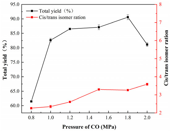 Figure 7 illustrates the effect of CO pressure on yield and the cis–trans isomer ratio of acetylene dicarbonylation. It was found that when the pressure of CO was 0.8 MPa, the total yield was only 62.5%. When the pressure of CO increased to 1.2 MPa, the total yield improved to 86.5%. In addition, the ratio of cis-to-trans isomers is essentially constant (2.6:1) within the range from 0.8–1.2 MPa of the partial pressure of CO. When the CO pressure was 1.8 MPa, the total yield was 92.3%. However, when the partial pressure of CO was increased to 2.0 MPa, the total yield fell to 81.3%, and the ratio of cis-to-trans isomers increased from 2.6:1 to 3.6:1. This result could be attributed to increased CO pressure causing palladium species coordination change, which is beneficial for trans isomer production.