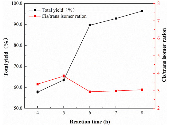 Figure 8 shows the reaction time effect on the catalytic activity of a nano-Fe/Pd catalyst. It was found that the total product yield (DMF and DMM) increases with the reaction time and reaches 96.3% after 8 h. Meanwhile, with the reaction time extended, the cis–trans isomer ratio remained constant at approximately 3:1 after 6 h. Under different reaction time conditions, the acetylene was almost consumed after more than 8 h.