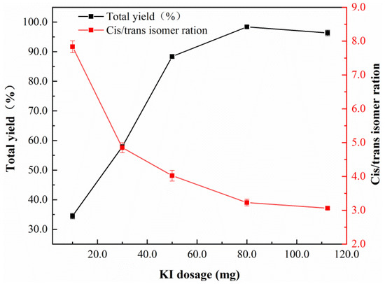 Additionally, as shown in Figure 9, the reactivity gradually rises as KI dosage increases. When the amounts of KI increases to 80 mg, the acetylene conversion rate reaches 98.4% and the reaction shows a high selectivity of unsaturated 1,4-dicarboxylic acid esters up to 99.7%. Meanwhile, as the amount of KI further increases, the cis–trans isomer ratio decreases. It is mainly because of the I- coordination configuration of intermediate products, which is conducive to the trans-insertion of coordinated acetylene. All the nano-Fe/Pd catalysts exhibited higher activity than the other reported catalysts Pd(nanosheet)/AC [6], Pd/Fe2O3 [7], and homogeneous PdCl2 system [28].