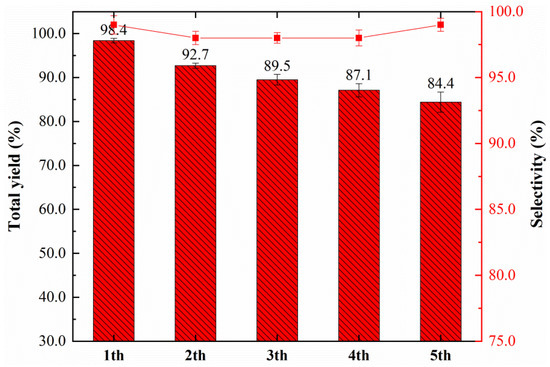 Recycle study of nano-Fe/Pd catalyst for acetylene dicarbonylation and selectivity of production (red line). Reaction conditions: catalyst (10 mg), acetylene (11 mmol), MeOH (20 mL), KI (80 mg), PCO = 1.8 MPa, Ptotal = 4.0 MPa, T = 323.2 K, t = 8 h.