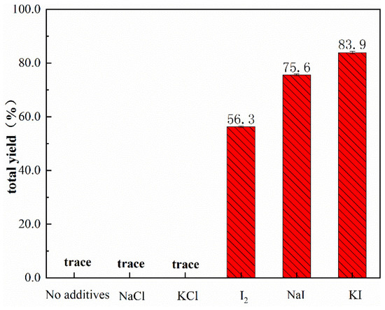 It was reported that I- was a weak base ligand that plays a pivotal role in the acetylene dicarbonylation reaction activity and mechanism [2,31]. Hence, the effect of the cocatalyst on the 1,4-dicarboxylic acid esters was also examined. As seen in Figure 11, replacing KI with NaCl and KCl as cocatalysts resulted in almost no reaction, indicating that the reaction hardly ever proceeds without iodine additives. In contrast, I2 was used as a cocatalyst and obtained a good yield of 56.3%. It could be due to hydriodic acid being continually generated in situ during the reaction process, with the latter initiating the catalytic cycle by forming a Pd-I species. Overall, it was believed that the cocatalyst KI was the most effective co-catalyst available.