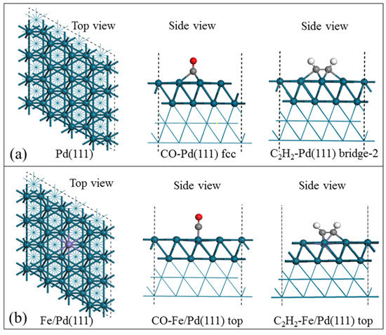DFT optimized structures. (a) Pd (111) and (b) Fe/Pd (111), and CO or C2H2 energetically favored adsorption configurations on catalyst surfaces.