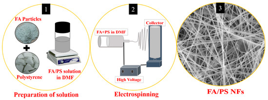 The utilization of discarded materials as a nanofiber precursor in electrospinning not only provides a remedy for environmental pollution, but also is cost-effective since the discarded materials are freely available [45,46]. Based on these understandings, herein, we used two waste materials (discarded PS and FA particles) to prepare FA-incorporated PS fibers. The as-prepared fiber composite was characterized with various techniques and tested for fire-retardant performance. The strategy presented in this work provides a new approach to using discarded materials for various applications such as a fire-retardant, food packaging, filtration, etc.