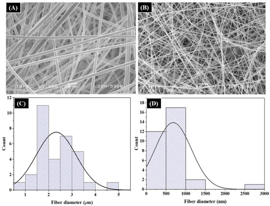 SEM images of as-spun pristine PS fibers (A) and FA/PS fibers (B). (C,D) are the diameter distribution curves of PS fibers and FA/PS fibers, respectively.