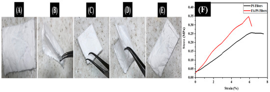 (A) Optical images of as-prepared FA/PS membrane, (B) during folding, (C) folded with 180°, (D) during unfolding, and (E) after unfolding. (F) is the stress–strain curve of the as-prepared FA/PS fiber membrane compared to PS fiber membrane.