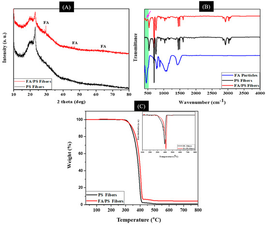 The crystal structure of as-prepared pristine PS and FA/PS fibers was evaluated by an XRD analysis. As shown in Figure 6A, the pristine PS showed two diffraction peaks approximately at 2θ value of 19.1 and 22°, which represents the (110) and (220) crystal planes, respectively [52,53]. For the FA/PS composite, the extra peaks were observed, which confirms the presence of FA particles on it [13]. FTIR spectra of electrospun PS NFs and FA/PS composite are presented in Figure 6B. In the IR spectra of FA, the marked peaks at about 460, 1098, and 1450 cm−1 are attributed to the Si–O–Al, Si–O–Si, H–O–H bands, respectively [47,54]. Pure PS showed three obvious characteristic absorption bands. The lower absorbance intensities at 3200–2800 cm−1 were assigned as C–H symmetric and asymmetric vibration. The wavenumber at 1600–1400 cm−1 corresponds to the bending vibration, and the stronger intensities around 770–650 cm−1 are attributed to the mono-substituted benzene [53]. The FA/PS composite showed almost similar peaks as pristine PS. An extra band near 460 cm−1 in FA/PS fibers (arrow in Figure 6B) is attributed to the FA in the composite sample [13]. The peak intensity in the FA/PS fibers is remarkably decreased compared to the pristine FA and PS, suggesting the homogenous deposition of FA into PS throughout the matrix [55].