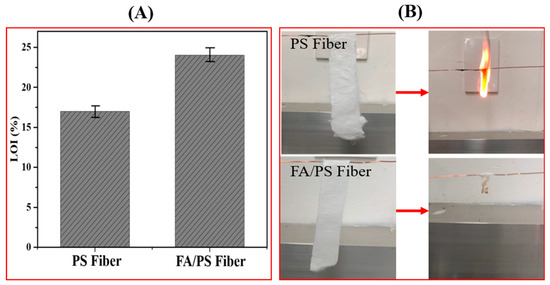 Comparison between the LOI values (A) and flame test for PS fiber and FA/PS fiber membrane (B).