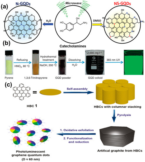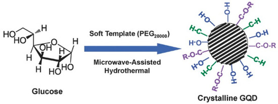 Additionally, the synthesis of GQDs via the soft-template method is common nowadays. This route helps to achieve very precise control over the size distribution of the particles, and complicated purification steps are mostly bypassed. However, aggregation of particles due to π–π stacking is common and cannot be avoided most of the time. Tang et al. synthesize monodispersed single-crystalline GQDs by using soft template method, followed by microwave and hydrothermal treatment to the starting materials (Figure 8) [77].
