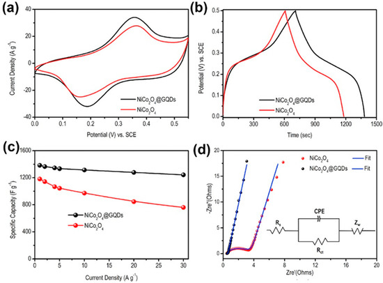 Tunable bandgap and high charge transport phenomena of GQDs have been successfully utilized to modify the electrode surfaces. The graphene structure inside GQDs boosts the electrical conductivity, electrolyte diffusion, and charge transportation between the electrode and analyte and, thus, leads to improved electrochemical performance. To date, various approaches have been reported to design GQD-based electrochemical devices with modified electrode surfaces and properties. N,S-GQDs were prepared via the hydrothermal method and, after that polymerization of aniline, resulted in the formation of N,S-GQDs/polyaniline (PANI) composite material. The addition of N,S-GQDs to the PANI-based electrode resulted in higher electrical conductivity to the double layer capacitor through extended electron delocalization due to the π–π interactions [106]. Here, doped hetero atoms in N,S–GQDs acted as trapping sites for the electrolyte ions. Besides, GQDs assisted in enhancing the surface area of the electrode material which led to more access to the electrolyte ions. Compared to the PANI electrode, the N,S-GQDs/PANI electrode showed a more rectangular CV plot and longer discharge time, indicative of better electrochemical phenomena and higher specific capacitance. At the 0.5 A g−1 current density, the maximum specific capacitance for the N,S-GQDs/PANI electrode was 645 F g−1, whereas the same for the pristine PANI electrode was measured to be 177 F g−1. In another work, Luo et al. conjugated GQDs with the NiCo2O4 p-type semiconductor, and the electrochemical properties were measured by using a three-electrode system in 2 M KOH electrolyte [107]. Here, a platinum electrode and a Ag/AgCl electrode acted as the counter and reference electrodes, respectively. As shown in Figure 12a, the GQDs/NiCo2O4 electrode consisted of a pair of enhanced redox peaks at 0.18 V- and 0.35 V-applied voltages. Such a peak originated due to good conductivity and fast charge transportation ability through GQDs/NiCo2O4 electrode material. Systematic variations in discharge time and specific capacitance have been shown in Figure 12b,c. The charge-transfer resistance (Rct) of the electrodes was studied by using electrochemical impedance spectroscopy (EIS). In Figure 12d, the Nyquist plots confirm 0.035 and 2.15 Ω of Rct for GQDs/NiCo2O4 and NiCo2O4 electrodes, respectively. This result further shows the better electrochemical activity of GQDs incorporated electrode material in comparison to the pristine counterpart.