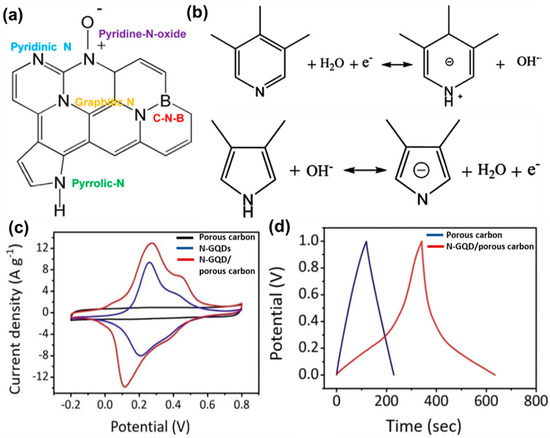 (a) Schematic representation for the hetero atom doped graphitic nano structure. (b) Proposed pseudocapacitive reactions for the nitrogen-containing species. Reprinted with permission from Ref. [121]. (c) Cyclic voltammetry plots for porous carbon, N-GQDs, and N-GQDs/porous carbon electrodes at 10 mV s−1 scan rate and in 1.0 M H2SO4 electrolyte. (d) Galvanostatic charge–discharge plots for the supercapacitor electrodes at 0.5 A g−1 current density. Reprinted with permission from Ref. [108].