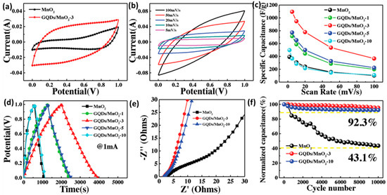 - Zhang, W.; Yang, Y.; Xia, R.; Li, Y.; Zhao, J.; Lin, L.; Cao, J.; Wang, Q.; Liu, Y.; Guo, H. Graphene-quantum-dots-induced MnO2 with needle-like nanostructure grown on carbonized wood as advanced electrode for supercapacitors. Carbon 2020, 162, 114–123. [Google Scholar] [CrossRef]