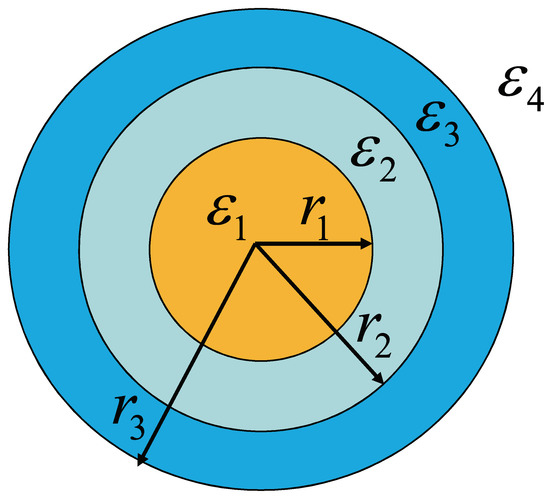 In the spherical coordinate system, the solution of Equation (1) with the electric potential in each region can be given by [31]