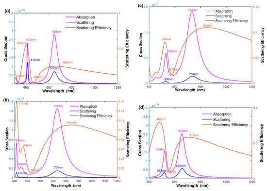 Figure 2 shows the spectra of light absorption, scattering, and scattering efficiency as a function of wavelength, where the geometric parameters are = [10 nm, 25 nm, 30 nm] and . By examining the spectra of silver–dielectric–silver three-layered nanoshell as a function of wavelength in Figure 2a, we can see that three peaks , and appear in the spectra, caused by the plasmon hybridization [14,15,17,18]. Experimentally, the two peaks at longer wavelengths and can be easily detected. We can also see two longer absorption wavelength peaks at nm and nm. The longest wavelength nm, denoted as , corresponds to an anti-symmetric coupling between the solid inner sphere and outer bonding nanoshell. The peak at the wavelength nm, denoted as , is caused by a symmetric coupling between the solid inner sphere and outer bonding nanoshell. The corresponding scattering peaks are located at nm () and nm (). Unlike the intensity of absorption, the intensity of scattering intensity is much weaker than that of absorption. Therefore, the scattering efficiency as a function of wavelength in Figure 2a corresponds to the relative scattering intensity between scattering and absorption. Three peaks appear in the optical spectrum, for which two main peaks with a larger ratio of scattering efficiency are located at nm and nm. This implies that the underlying mechanism results in the peak of scattering efficiency differing from the plasmon resonance wavelength of absorption and scattering peaks. In addition, the scattering-efficiency peaks are wider than the absorption and scattering peaks. Experimentally, it is crucial to improve the scattering efficiency for cell and biomedical imaging applications with minimized absorption by adjusting its geometric parameters. Figure 2b shows the spectra of the silver–dielectric–gold three-layered nanoshell. Two main absorption peaks appear at about nm and nm, which can be attributed to the plasmon hybridization between a solid silver sphere and a gold nanoshell, indicating that the LSPR could be modulated by adjusting the material composition. Compared with the silver-dielectric-silver nanoshell, the scattering efficiency peaks of the silver–dielectric–gold nanoshell appeared at nm, and nm demonstrated that the scattering efficiency strongly depends on its material component. To help understand the effect of geometric parameters on the optical properties, Figure 2c,d show the spectra of gold-dielectric-gold and gold–dielectric–silver nanoshells. The spectra of the gold-dielectric-gold and gold–dielectric–silver nanoshells are similar to that of Figure 2a,b, where the scattering efficiency of the gold–dielectric–silver nanoshell is higher than that of the gold-dielectric-gold nanoshell. As a result, the scattering efficiency can be improved by adjusting the geometric parameters.