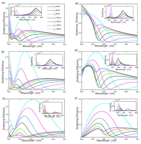 To fully understand the influence of geometrical parameters on the scattering efficiency, we examine the effect of separated dielectric layer thickness on the scattering efficiency of silver–dielectric–gold nanoshells and gold–dielectric–silver nanoshells with different middle dielectric radius in Figure 4. The middle dielectric layer radius is increased from nm to nm, whereas the radii of the inner core and outer shell are fixed at nm and nm. Figure 4a shows that the intensity of scattering efficiency decreases quickly as the middle dielectric wall thickness increases from nm to nm with . The scattering-efficiency intensity remains at a constant when the middle dielectric thickness is large enough ( nm). The scattering efficiency exhibits a blue shift with the increasing thickness of the middle dielectric layer. The inset of Figure 4a shows the scattering cross section has a blue-shift with increasing the thickness of due to plasmon hybridization [14,29]. The corresponding physical phenomenon implies that the thickness of the outer nanoshell reduces by increasing the middle dielectric layer radius. The influences of the middle dielectric function and surrounding medium function on scattering are also exhibited in Figure 4b,c with and respectively, the same as that in Figure 3a–c. In addition, the effects of middle dielectric thickness on the gold–dielectric–silver nanoshell are also given in Figure 4d–f, showing similar features to that in Figure 4a–c.