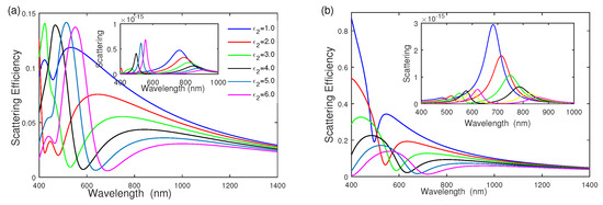 Figure 3 shows the effect of inner radius on the scattering efficiency of silver–dielectric–gold, where the inner silver radius is increased from nm to nm with = [20 nm, 25 nm], and for Figure 3a, for Figure 3b, and for Figure 3c respectively. The results show that the scattering efficiency of silver–dielectric–gold strongly depends on the inner core radius , and . As seen from Figure 3a, the intensity of each scattering-efficiency peak becomes intense and then reduces quickly with increasing the inner radius . The intensity of the scattering-efficiency peak reduces first and reaches the minimum when the inner core radius nm; it then becomes intense quickly as the inner radius increases. The spectral width of the scattering efficiency is wider as the inner core radius increases, where the peak position takes place at a red-shift [11,14,18]. The inset of Figure 3a shows the effect of inner core radius on the scattering cross section, plotted as the function of wavelength; the scattering section of mode takes place a red-shift, and its intensity reduces with increasing inner core radius . Figure 3b,c show the influence of the middle dielectric function and surrounding dielectric function on scattering efficiency, where in Figure 3b, and in Figure 3c. Figure 3b,c show that the scattering efficiency strongly depends on the middle dielectric function and surrounding dielectric function . The intensity becomes intense, and the spectral width becomes wider as the ratio of increases. In addition, the spectra of gold–dielectric–silver nanoshell are also shown in Figure 3d–f. Compared with Figure 3a–c, the scattering efficiencies of gold–dielectric–silver nanoshells are similar to those of silver–dielectric–gold nanoshells. The scattering efficiency strongly depends on the inner core radius and the ratio of , which becomes intense, becomes wider, and has a red-shift with increasing and . The scattering efficiency of gold–dielectric–silver nanoshell is higher than that of silver–dielectric–gold nanoshell under the same geometric parameter.