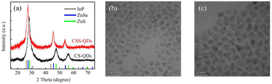 (a) XRD patterns for the CS-QDs and CSS-QDs. The vertical lines below indicate the diffraction peak positions of zinc-blended InP (gray), ZnS (green) and ZnSe (blue). (b,c) TEM images of both CS-QDs and CSS-QDs, respectively.