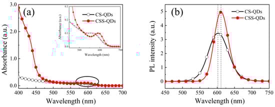 (a) UV-vis absorption spectra of both CS−QDs and CSS−QDs. The inset shows the details of band-edge absorption peaks of CS−QDs and CSS−QDs. (b) PL spectra of both CS−QDs and CSS−QDs.