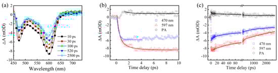 (a) TA spectra of the CSS−QDs pumped at 400 nm. The formation process (b) and decay dynamics (c) at 597 nm, 470 nm and PA extracted from (a). The solid lines are fit curves.