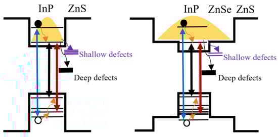 The excellent emission characteristics of InP-based QDs benefit from the appropriate passivation shell growth on the InP surface, which can not only improve the luminescence efficiency, but also enhance their stability. ZnS is a commonly used shell material due to its good chemical stability and larger band gap than InP, which leads to a good quantum confinement effect [17,18,19]. However, the large lattice mismatch of 7% between ZnS and InP will lead to more interface defects, which is not conducive to luminescence. Further, the introduction of ZnSe midshell can effectively improve the interface defects, due to the small lattice mismatch of 3.3% between ZnSe and InP [5]. The nearly 100% emission efficiency of InP/ZnSe/ZnS core/shell/shell QDs is an important premise for InP/ZnSe/ZnS QD-based LEDs to achieve excellent performance [20]. However, compared to Cd-based QDs, their luminescence properties still need to be improved to obtain better device efficiency and long-term stability [21]. The research on the photophysical process of the CSS-QDs is expected to provide insights into the improvement of the device performance.