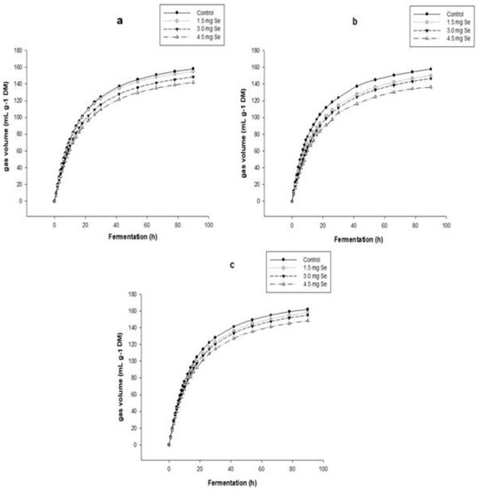 The decrease in total gas production can be attributed to increased phenolic compounds, flavonoids released in the ruminal fluid during fermentation, and foliar fertilization of SeNPs in the grass. Cajarville et al. [39] quantified the total gas production through an in vitro fermentation of 72 h of Festuca arundinacea forage, which produced 143.7 mL g DM−1, higher than the potential gas production of the fertilized grass with 4.5 SeNPs at 72 h of fermentation.