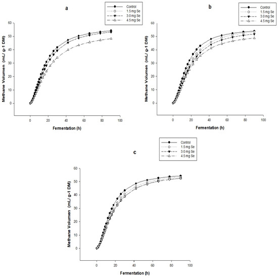 The study carried out by [11] found that in the supply of Se (20, 40, 60, and 80 mg Se kg−1 DM) in oat hay, there was a decrease in the total gas production in the fermentation as the content of sodium selenite was higher. The incorporation of phenolic compounds such as tannins in a ruminal fermentation influence the microbiota due to their ability to bind to the microorganism’s cell wall, causing morphological changes or the secretion of extracellular enzymes that cause changes in their metabolism [37]. The author of [40] carried out an in vitro study where he demonstrated that incorporating polyphenols generates a decrease in CH4. Furthermore, a study by [11] showed that increasing the selenium content in the in vitro fermentation of oat hay decreases the production of greenhouse gases such as methane. On the other hand, [41] found that the supply of polyphenol-rich olive leaves as a dietary additive affects methane reduction during in vitro fermentation due to a decrease in the proportion of methanogenic archaea in the ruminal fluid.
