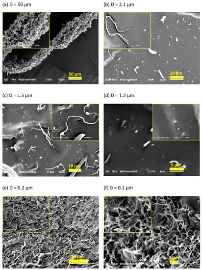 Figure 2b–f present SEM images of the cryo-fracture surface of EOC/dis-UHMWPE composites processed at 75 or 115 °C for 10, 30, or 90 min with the shear rate of 350 s−1. Figure 2b shows elongated inclusions, which evidences that the applied shear rate was high enough to achieve effective stress transfer from the molten matrix to the dispersed solid particles. The applied shear stress exceeded the critical value required for crystallographic slip and led to plastic deformation, which is favored by the low entangled state in the non-crystalline regions and the associated adjacent re-entry of chains [50]. Due to the high crystallinity and low chain entanglements in the non-crystalline regions, dis-UHMWPE powders were easily transformed into long fibers with an average diameter of 2.1 µm. This observation is in accordance with the ease of solid-state processing of these polymers [51]. However, as expected, the conditions during the preparation of the masterbatch affect the deformation ratio of nanofibers. Figure 2c,d reveal that solid-state deformation of dis-UHMWPE powders in molten EOC matrix depends on the shearing time. In particular, the longer the shearing time, the thinner the fibers obtained. It is observed in the images with higher magnification, in the insets of Figure 2b,c that increasing the shearing time from 10 to 30 min increases the fiber aspect ratio from 70 to 105.
