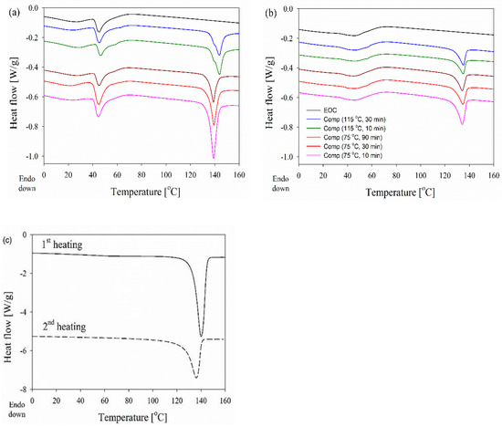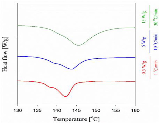In turn, the thermogram of the composite processed at 75 °C for 10 min is characterized by a single sharp melting peak with the Tm of 139 °C, which mainly corresponds to the melting of polyethylene crystals with an approximate thickness of 30 nm, as estimated by the Gibbs–Thomson Equation (5), and Δhm corresponding to Xc of 62%. Shearing the composite at the same temperature but for longer times of 30 and 90 min changed neither the dis-UHMWPE melting peak temperature range nor Tm, but Xc decreased to ca. 40%.