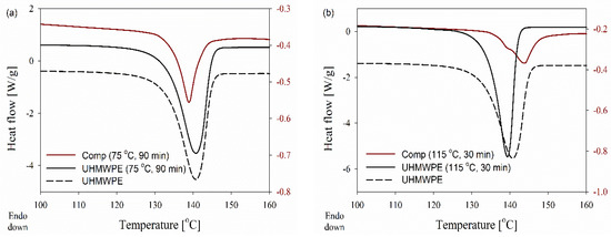 DSC curves obtained during the first heating of the disentangled UHMWPE and (95/5 wt.%) composite at 10 °C min−1, where dis-UHMWPE and the composite were annealed and processed respectively at: (a) 75 °C for 90 min, (b) 115 °C for 30 min.