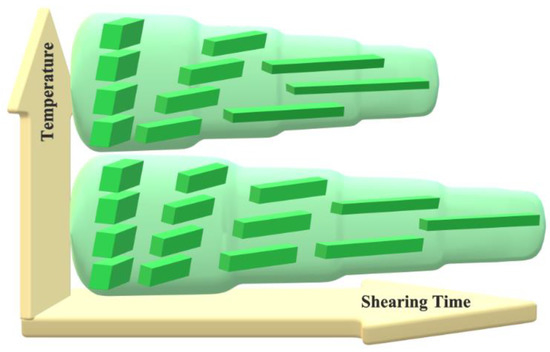 Voznyak et al. [16] developed a method of fabricating all-polymer nanocomposites by shearing an immiscible polymer blend at such processing conditions that dispersed polymer inclusions undergo strong shear deformation with simultaneous shear-induced crystallization. The method was illustrated in the case of polylactide with dispersed polybutylene succinate (PBS) inclusions that were sheared and longitudinally deformed in the extruder with simultaneous cooling in a slot capillary, and PBS nanofibers were formed and crystallized. Shearing of PBS increases the nonisothermal crystallization temperature by as much as 30 °C. Hosseinnezhad and Voznyak obtained several polylactide-based nanocomposites according to that procedure: with aliphatic–aromatic co-polyesters [17], polyhydroxyalkanoate [18], and polyamides [19,20] succeeding in the formation of nanofibers by strong shearing of a blend of the two immiscible polymers and followed by shear-induced crystallization of nanofibrillar inclusions.