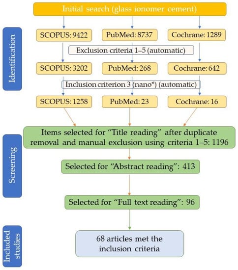 After applying the above-stated exclusion and inclusion criteria, as well as title, abstract, and, full text reading, a total of 68 articles were selected for inclusion in the present review (Figure 1), covering the modification of GICs with metallic nanoparticles (Cu, Ag), metallic and metalloid oxide nanoparticles (TiO2, ZnO, MgO, Al2O3, ZrO2, SiO2), and apatitic nanomaterials, as well as other types of nanomaterials and nanocomposites (nanoclays, multi-component nanocomposites, etc.). To the selected articles, other works were added for providing the necessary context. These articles were retrieved by a “search and find”/manual selection approach using the SCOPUS database (by searching using specific keywords), or were suggested by the reviewers during the peer-review process.