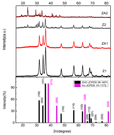 The resulting nanomaterials have high crystallinity since all peaks are sharp, as seen in Figure 2, and no further annealing treatment was needed. The crystallite size was calculated based on the full width at half-maximum of the (1 0 1) diffraction peak using Debye–Scherrer formula and resulted in a value of 11.9 nm for Z1 compared to 10.4 nm for those decorated with Au-ZA1 indicating a slight decrease in crystallinity after Au NPs synthesis step. When only ethanol was used as a solvent in syntheses, the crystallite size is increased at 15.8 nm for Z2 and 15.1 nm for ZA2.