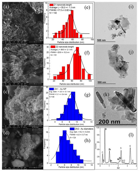SEM images of the (a) Z1, (b) Z2, (c) ZA1, and (d) ZA2 samples; Histogram distributions of the (e) Nanorods length in Z1, (f) Nanorods length in Z2, (g) Au NPs diameters in ZA1, and (h) Au NPs diameters in ZA2, (i) TEM image of ZA1, (j) TEM analysis of ZA2; (k) TEM magnification of sample ZA2 (l) EDX analysis of ZA2 sample.
