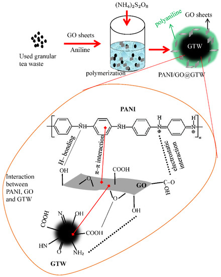 A facile oxidation method was used to synthesize the PANI/GO@GTW composite. The used GTW is the core material. having functional groups such as COOH, NH2, NH, OH, C = C, etc. from the various components of the tea leaves such as cellulose, lignin, amino acids, pectin, carbohydrate, polyphenols, etc. [22], while the GO sheets have the C = C, COOH, OH, = O, etc. groups and polyaniline has the NH, NH2, and C = C groups on their surface. These functional groups present on the surface of the GTW, GO, and PANI can interact through H-bonding, π–π, and electrostatic bonding [27]. A schematic diagram for synthesizing the PANI/GO@GTW composite has been shown in Figure 1.