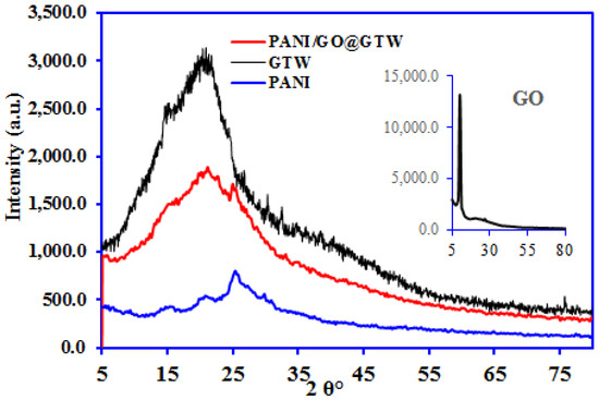 Various characterization tools have been used to confirm the successful synthesis of the prepared composite materials. Figure 2 depicts the XRD pattern of the pure GO, PANI, GTW, and PANI/GO@GTW composites. The XRD pattern of the GO reveals a characteristic peak at 10.23° (001), confirming the successful conversion of the graphite to GO. The XRD pattern of the GTW demonstrates a wide peak centered at 21° due to the cellulosic structure, indicating the amorphous nature [28]. The PANI shows the semicrystalline nature as the peaks appeared at 21.34° and 26.69° [29]. The PANI/GO@GTW composite pattern is similar to GTW and PANI, having the same peaks for the cellulosic structure in tea and PANI at 21.25° and 26.2°. However, the characteristic peak for the GO was not observed in PANI/GO@GTW due to its low amount. Moreover, the amorphous nature of the GTW may hide the peak for the GO in the PANI/GO@GTW composite.