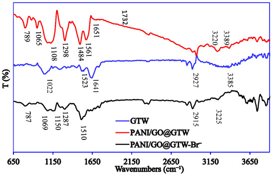FTIR spectrum of GTW, PANI/GO@GTW, and Br− adsorbed PANI/GO@GTW.