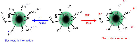 The solution pH is instrumental in Br− adsorption as it strongly overlaps with hydrogen desorption, particularly in an acidic medium [35]. Figure 6 demonstrates the interaction behavior of the pure PANI, PANI/GTW, PANI/GO, and PANI/GO@GTW. The Br− adsorption results indicate that the PANI/GO@GTW composite is the most efficient adsorbent, and the following Br− adsorption behavior is observed: PANI/GO < PANI/GTW < PANI, <PANI/GO@GTW. The PANI/GO showed a lower adsorption capacity, possibly due to the convergence of the GO active sites by the PANI. In this situation, the GO active sites were not available for Br− adsorption. The highest Br− adsorption was observed in the acidic medium. The adsorption behavior of the Br− ions onto the prepared materials can be owed to the surface functional groups on the PANI/GO@GTW composite. The presence of these various functional groups on the surface facilitates l more Br− ion adsorption. Therefore, the PANI/GO@GTW composite showed the highest Br− adsorption at all the studied pHs than the PANI, PANI/GTW, and PANI/GO composites. Although pH 3 is the most suitable condition for the adsorption of the anionic Br− ions, due to electrostatic interaction with the positively charged adsorbent surface, the adsorbent surface absorbed the H+ from the solution, and simultaneously, Br− ions co-adsorbed to compensate for the surface charge [36]. With the rise in the solution temperature, the −OH ion concentration increased, which is a competitor of the Br− ions for the same active sites [17]. Moreover, excess −OH ions cause the deprotonation of the amine, carboxylic, and hydroxylic groups, resulting in electrostatic repulsion between the negatively charged adsorbent surface and Br− ions [37]. Hence, a gradual reduction in Br− adsorption was observed at higher pH conditions. A schematic diagram for the adsorption of Br− ions onto the PANI/GO@GTW composite is shown in Figure 7 under acidic and basic solution conditions. Based on this study, pH 3 and the PANI/GO@GTW composite were selected for further optimization of the experimental conditions.