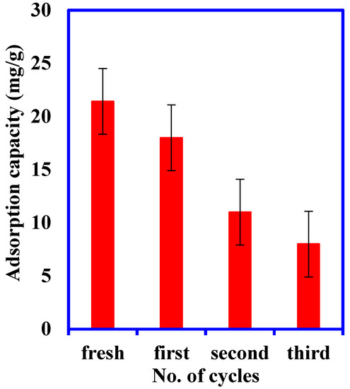 This is an additional step conducted to evaluate the ability of the PANI/GO@GTW to adsorb the Br− ions over a number of cycles. The reuse of the PANI/GO@GTW started with washing the leftover saturated materials with acetone and ethanol. As shown in Figure 10, there was a decrease in the adsorption capacity from 21.1 mg/g to 8 mg/g after four cycles. It can be assumed that all the active sites were not regenerated during the desorption process; therefore, the reusability of the PANI/GO@GTW decreases gradually [17].