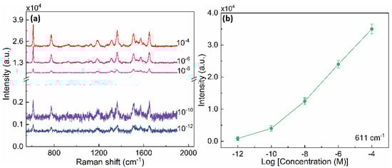 (a) Raman spectra of R6G molecules on gold AGAs-P500 with different concentrations, ranging from 10−4 M to 10−12 M. A scale break is deliberately inserted in the vertical axis in order to visualize weak Raman peaks. (b) The relationship between the Raman intensity at a peak of 611 cm−1 of R6G molecules and concentrations.