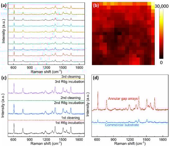 (a) Randomly collected ten Raman spectra of R6G molecules at a concentration of 10−4 M over 1 mm2 on gold AGAs-P500. (b) Raman mapping image of 10−4 M R6G on the gold AGAs substrate over 17 µm × 17 µm with a step size of 1 µm. (c) Measured Raman spectra from the same gold AGAs-P500 substrate after 3 cycles of R6G incubating and oxygen plasma cleaning. (d) Raman spectra of R6G molecules at concentration of 10−4 M on the gold AGAs-P500 substrate and the commercial Hamamatsu gold SERS substrate.