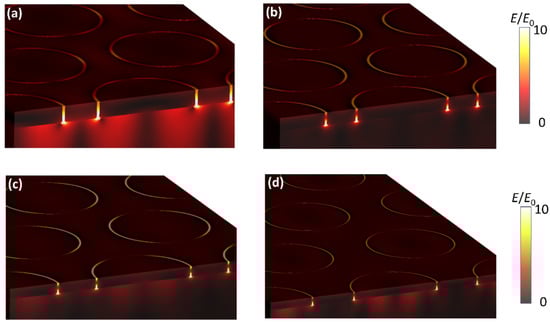 3D FDTD simulations of near-field electric field distributions of AGAs-P500 (a), AGAs-P600 (b), AGAs-P800 (c), and AGAs-P1000 (d) under an excitation wavelength of 633 nm.