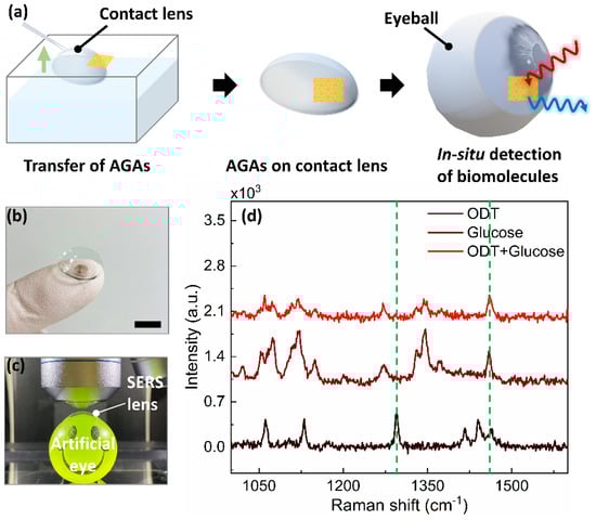 Diabetes resulting from a high level of glucose is one of the metabolic diseases that endanger human health. The level of glucose is, therefore, of great significance for the diagnosis, monitoring, and treatment of clinical diabetes [47]. Although a high fasting glucose level in blood can be diagnosed as a sign of diabetes, due to the inconvenience and infection risk of blood tests, non-invasive and in situ monitoring of glucose levels has been extensively attempted [48,49]. Considering that glucose is present not only in blood, but also in tears [50], the accurate monitoring of the glucose level in tears by employing smart sensors, such as a contact-lens-type sensor, is expected to be an alternative approach for non-invasive glucose monitoring. We demonstrated the versatility of our method for unconventional application of SERS by employing a “SERS contact lens,” which can potentially enable detection of glucose levels in tears. The SERS lens can be simply fabricated by transferring gold AGAs onto commercially available contact lenses, as presented in Figure 7a. The fabricated SERS lens (gold AGAs-P500) was incubated in a 1 mM ethanol solution of ODT in order to form a uniform monolayer, which could act as a partition layer during glucose analysis [51]. Figure 7b shows a photograph of the fabricated SERS lens on a commercially contact lens. A drop of 1 mM (which corresponds to the glucose level in the tears of diabetes patients) aqueous solution of glucose was released onto the fabricated SERS lens, which was mounted on an artificial eye (Figure 7c). Figure 7d shows the obtained Raman spectra, in which the characteristic Raman peaks at 1270 cm−1, and 1461 cm−1 of glucose molecules were clearly detected with a detection limit of 0.1 mM (Figure S5). However, for the real practical applications of the SERS contact lens, the applicability of retina-safe laser excitation also remains a huge challenge [47,52]. These need to be properly addressed for further development of future non-invasive optical wearable devices.