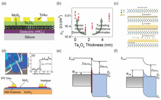 In previous sections, contact engineering has been realized by using 3D or 2D metallic materials, performing phase transition and introducing degenerate doping. Another strategy to suppress the Fermi-level pinning effect is introduced in this section. To decouple the orbital overlap, a thin insulating tunnel layer is inserted between the metal and semiconductor. The insulating buffer layer will increase the distance between the metal and semiconductor, which is an efficient way to suppress interface interaction, and the interlayer will inhibit high energy damage induced by the metal deposition process. The decrease in MIGS results in a reduced Schottky barrier height [82]. However, the thickness of the interlayer should be properly tuned because the electron tunneling through the insulating buffer layer is mandatory. Furthermore, the charges are injected by direct tunneling or Fowler–Nordheim tunneling dependent on the band alignment. Chen et al. first reported the insertion of a thin MgO film for Co−contacted monolayer MoS2 FETs [83]. The Schottky barrier height was reduced from 60 to 9.7 meV with the increasing MgO thickness from 0.9 to 2 nm. Lee et al. showed a statistical study of Schottky barrier height by inserting a thin tunneling Ta2O5 layer between MoS2 and metal contacts, as shown in Figure 7a [84]. They pointed out that a thin tunnel layer with a sub−2 nm thickness could allow efficient tunneling, as shown in Figure 7b. The remarkably suppressed Fermi-level pinning has also been demonstrated with other dielectric layers, such as h−BN [82,85,86], ZnO [87] and TiO2 [14]. Kwon et al. reported that defect-free vdW contacts were formed via a metal-deposition process with a selenium buffer layer on 2D layers, as shown in Figure 7c [88]. The device obeyed the Schottky-Mott rule and had a Fermi-level pinning factor of 0.91. Andrews et al. achieved a low Schottky barrier height of 25 meV by using MoSe2 as an interlayer between MoS2 channel and Ti electrodes, as shown in Figure 7d [89]. The reduction in Schottky barrier height can be attributed to the synergetic effect of Fermi-level pinning close to the conduction band edge of the MoSe2 interlayer and the favorable conduction band offset between the MoSe2 interlayer and MoS2 channel, as shown in Figure 7e,f.